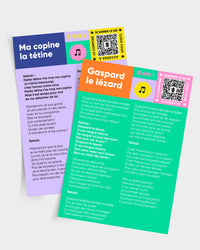 - Deux comptines : Elles permettent de faire passer des messages importants à l’enfant : le préparer à se séparer de sa tétine et comprendre les enjeux de cette séparation sur sa santé. "Ma copine la tétine" (format mp3 audio) et "Gaspard le lézard" (format mp4 clip vidéo).