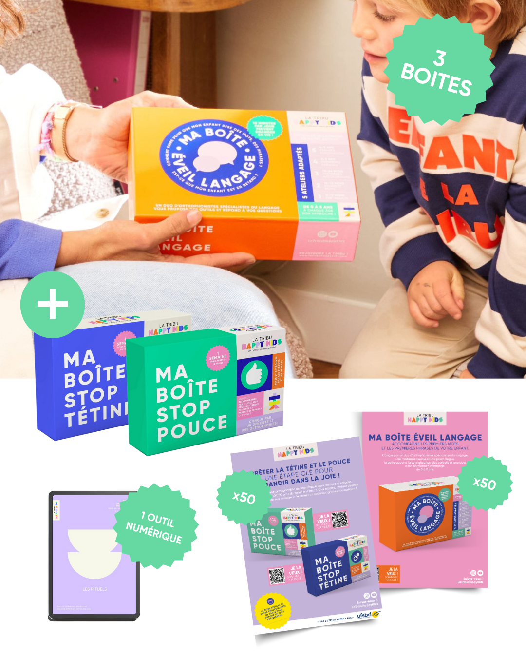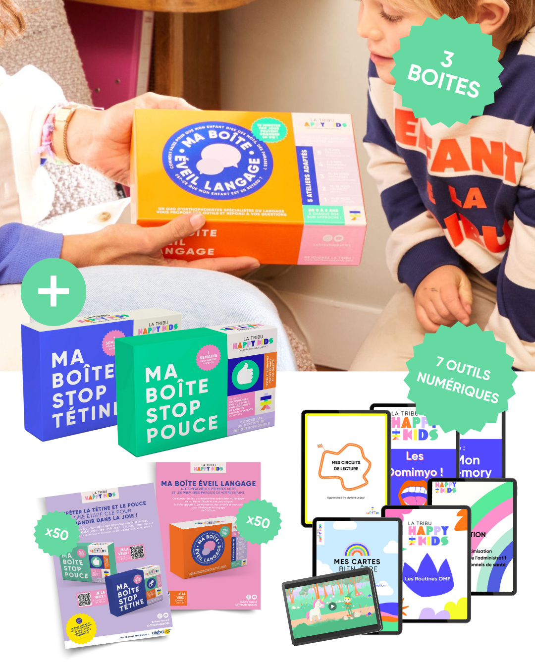 Le coffret original de La Tribu Happy Kids a été réfléchi pour proposer aux professionnels de santé des outils adaptés à leur champ de compétences : langage, déglutition, respiration, etc.