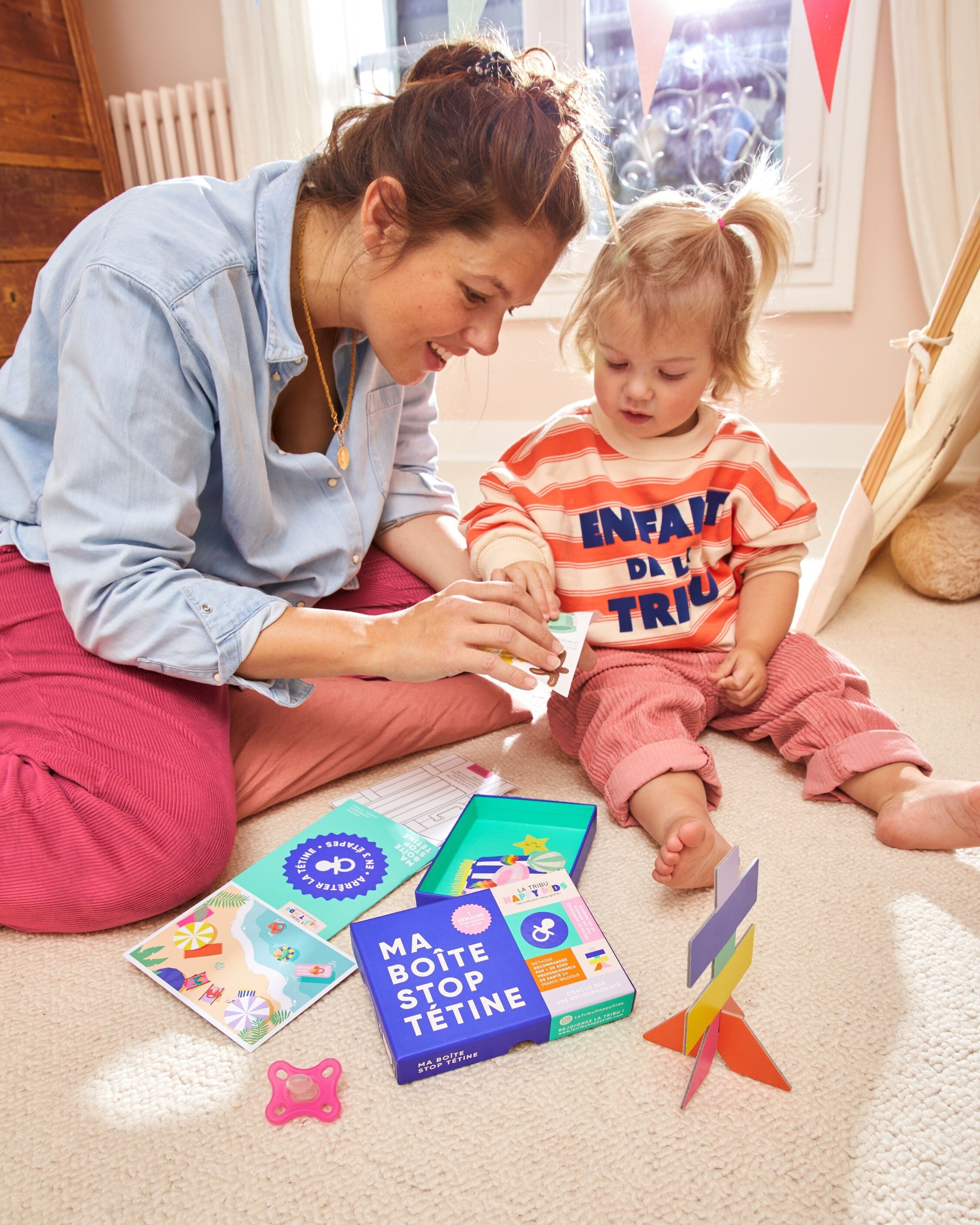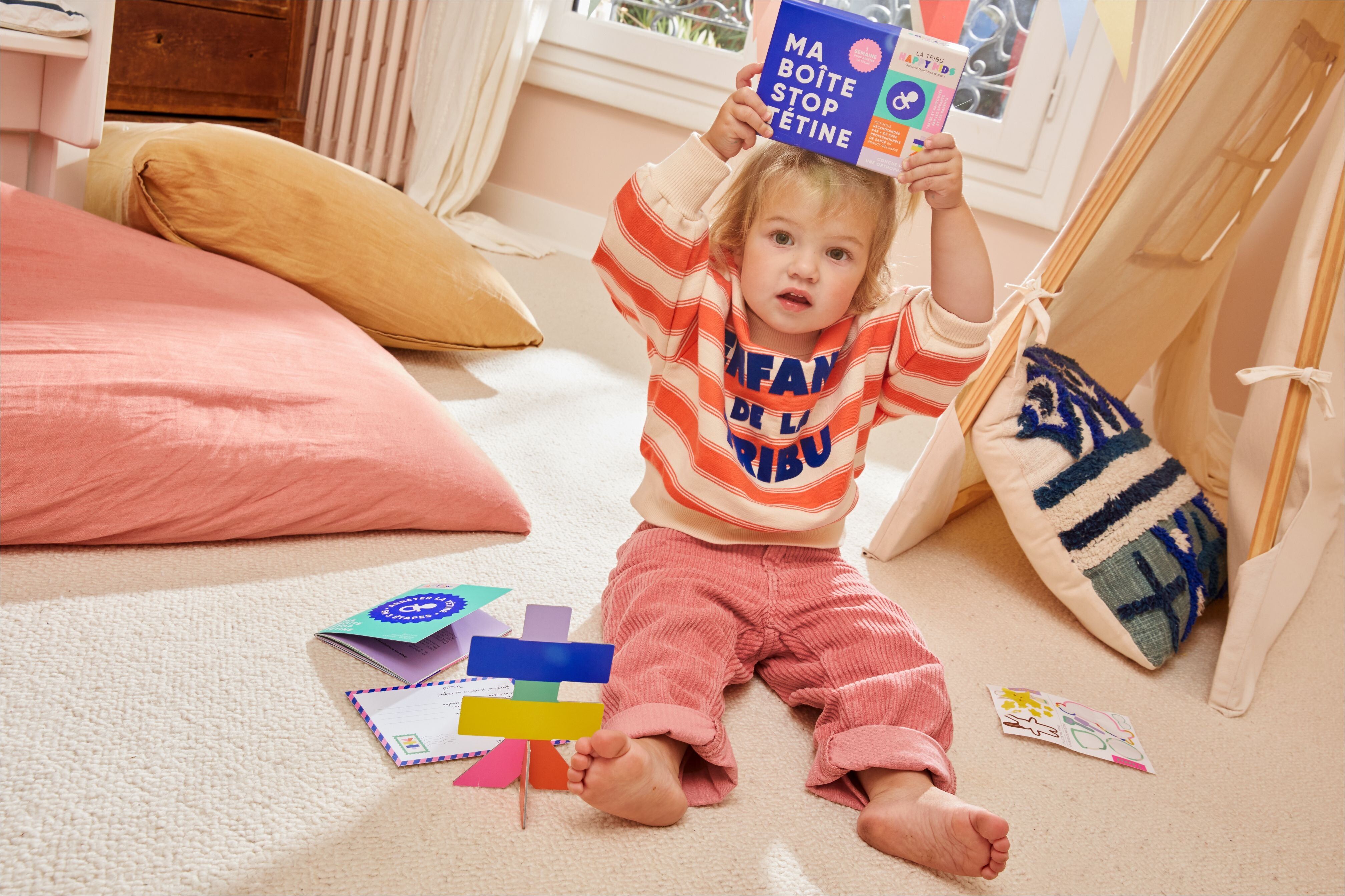 Pour aider toutes ces familles, Rachel Dutordoir, une des orthophonistes de La Tribu Happy Kids a créé ”Ma Boîte Stop Tétine’’, une méthode unique avec des comptines pour arrêter la tétine de manière ludique et bienveillante !